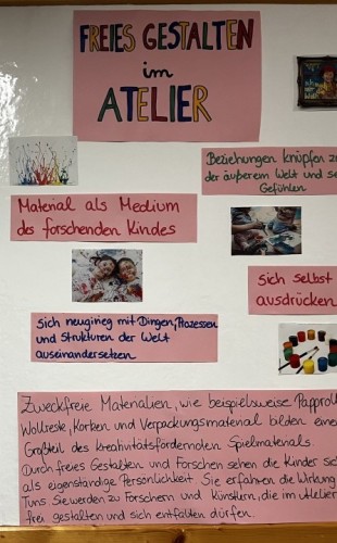 Hier dürfen die Kinder mit unterschiedlichen Materialien z.B. aus der Natur, mit Farben und alltäglichen Gegenständen.